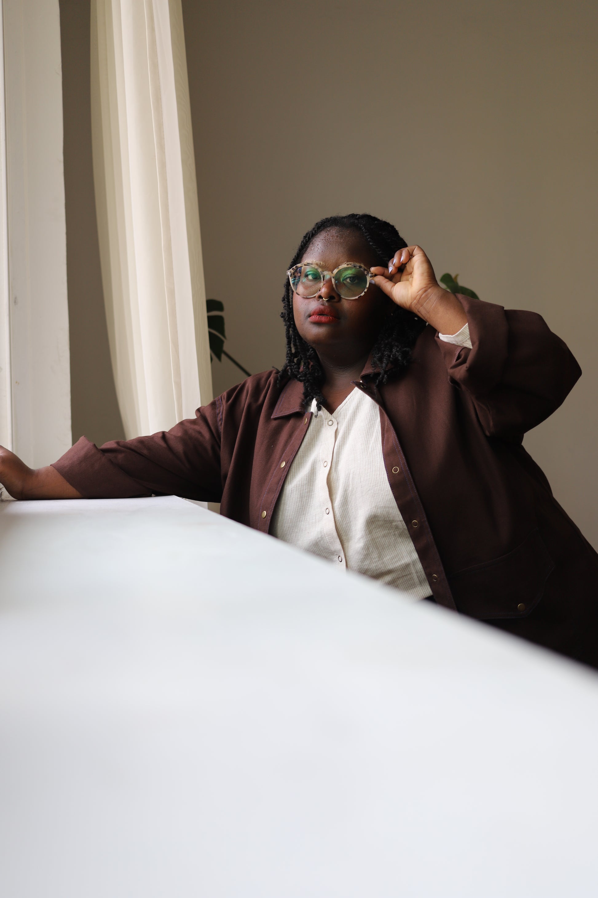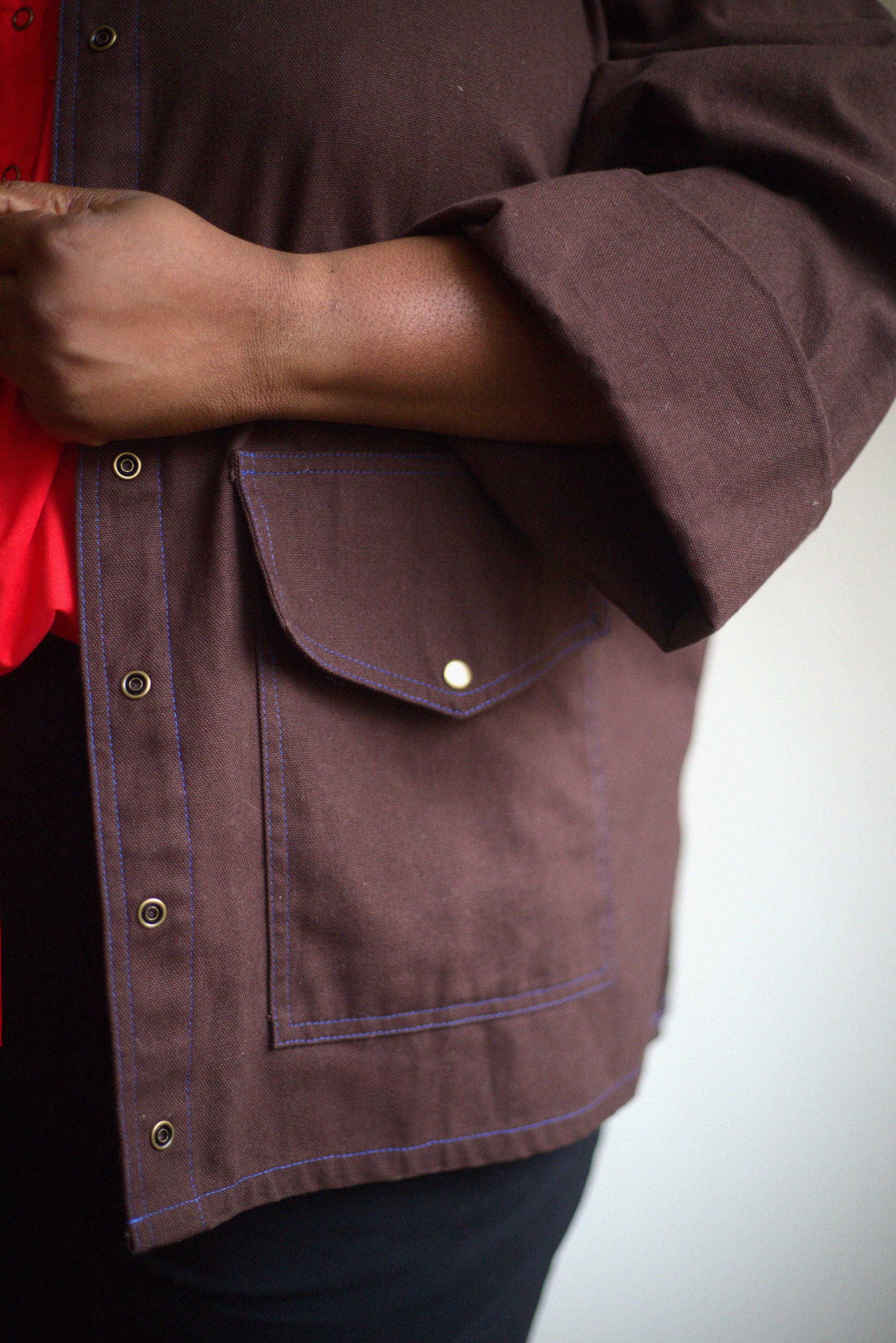 Subtle cobalt blue topstitching gives it a distinctive finish, while thoughtful tailoring ensures comfort and ease. The slightly oversized cut and generous sleeves make layering simple, whether over tees, knits, or dresses.