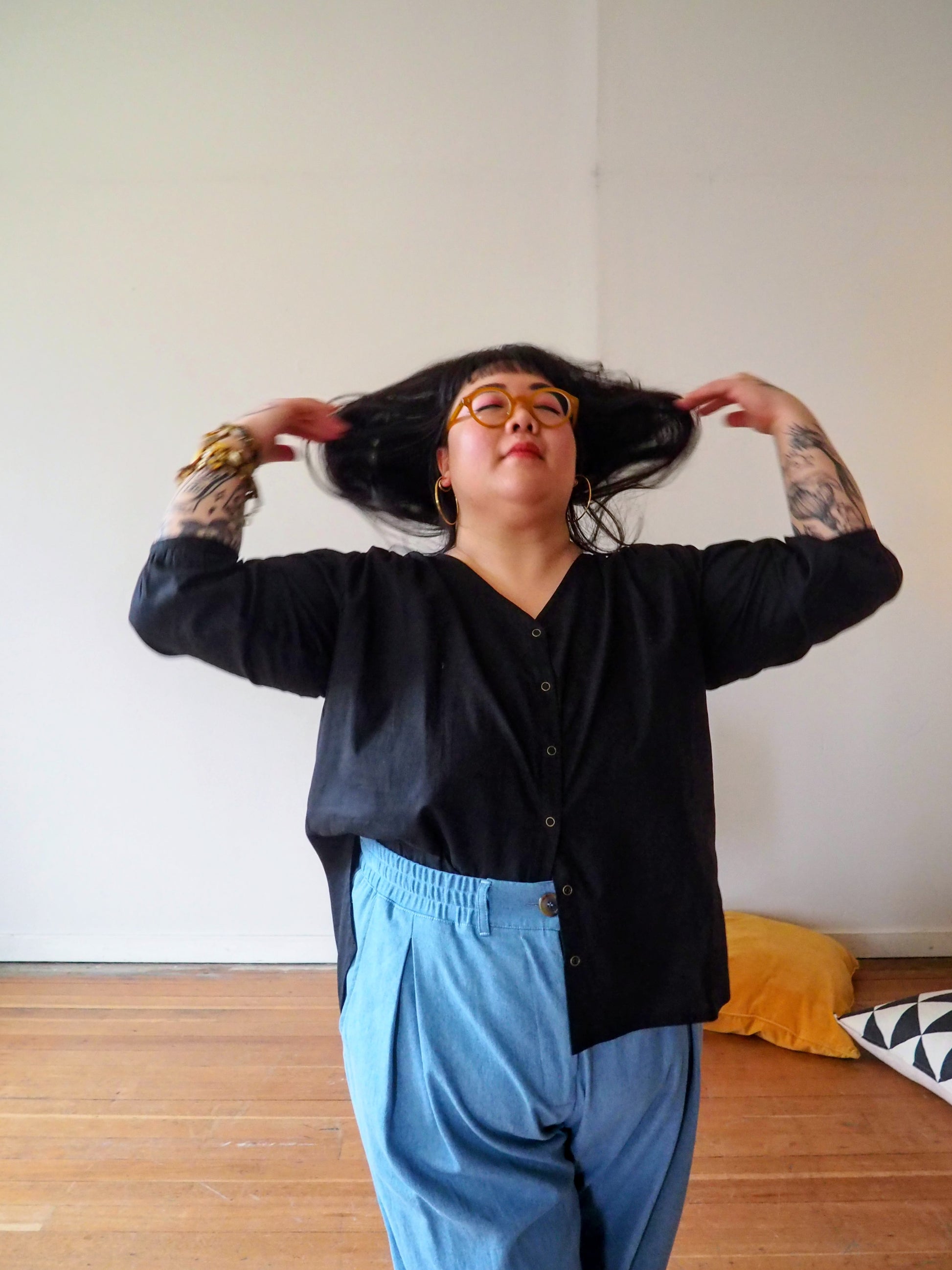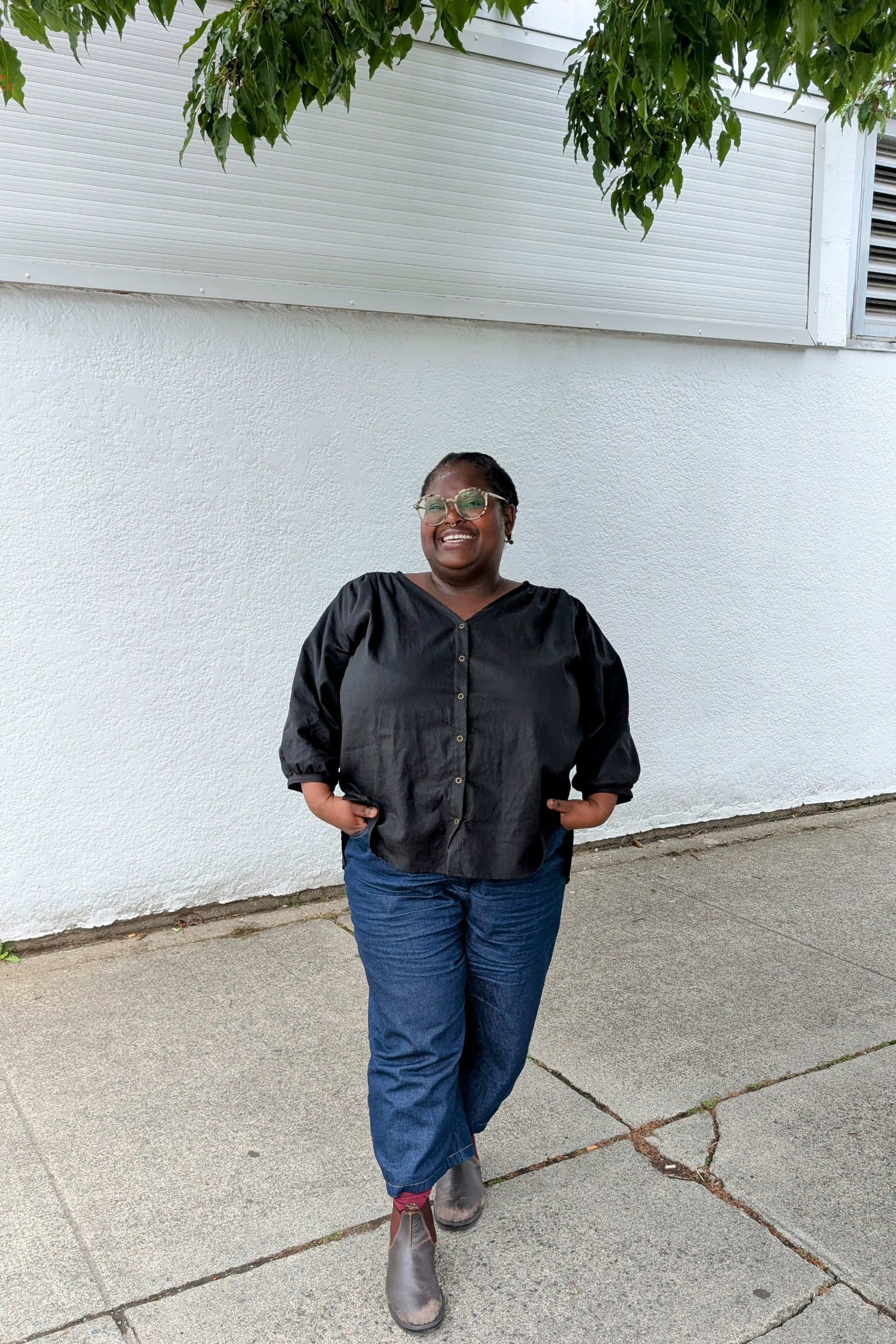 The Margot V Neck Shirt in black cotton-linen is a magical wardrobe piece that balances ease and refinement. Whether you’re heading to the office, catching a ferry, wrangling small humans, or enjoying a slow morning coffee, Margot fits seamlessly into your day.