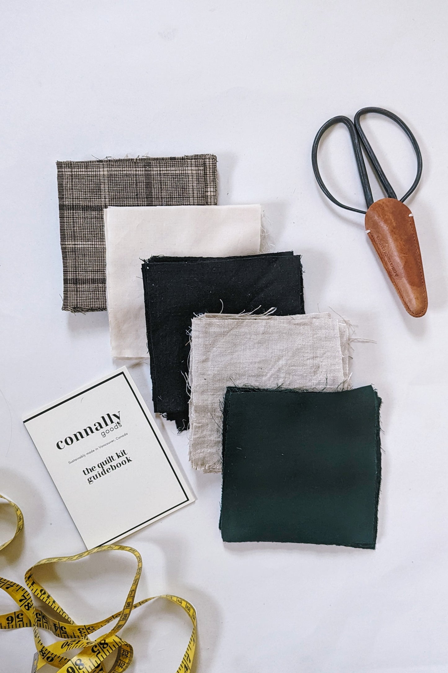 We’ve made quilting simple for everyone. Each kit uses production scraps to create a 50” x 50” quilt topper, made from 100 pre-cut 5” squares. The fabrics are machine washable and include hand-dyed cottons, vintage fabrics, solids, and prints from production.